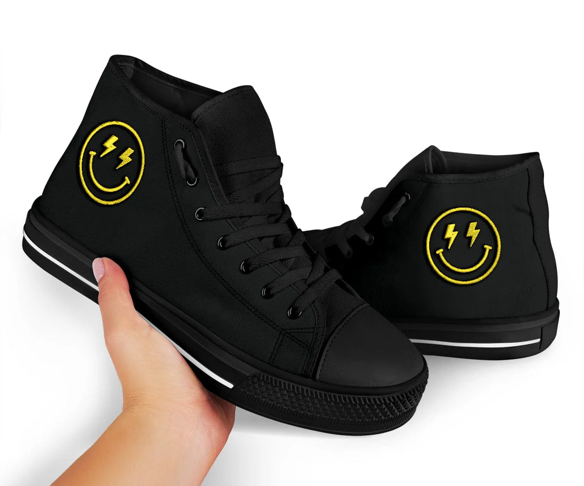 Embroidered Lighting Bolt Yellow Smiling Face High Top Shoes