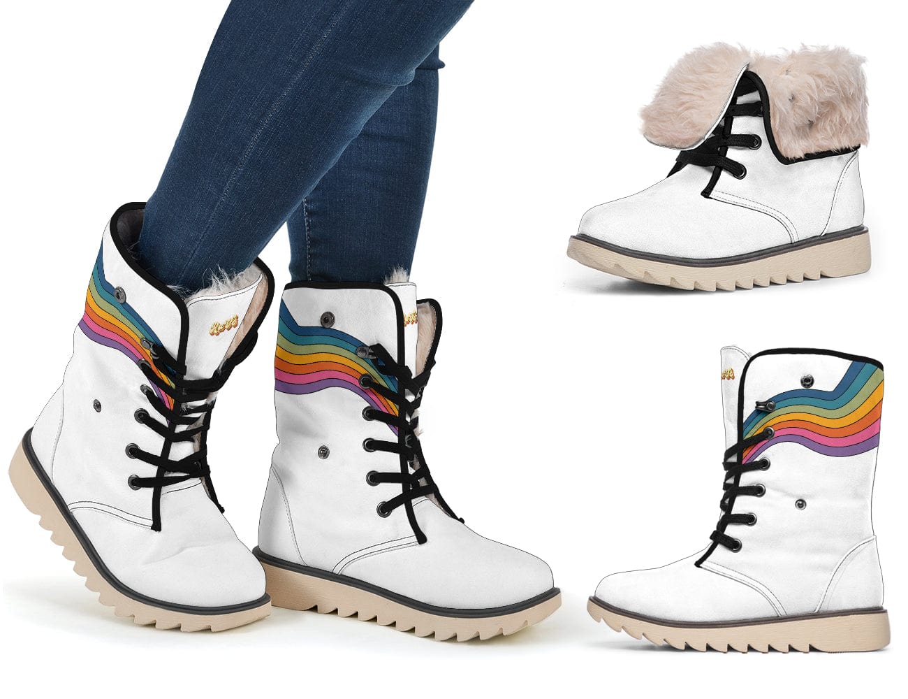Stride Through Snow with a SmileBring a burst of color to your winter wardrobe with our Rainbow On White Suede Snow Boots! Featuring a vibrant rainbow design against a crisp white background, these boots will brighten even the dreariest of winter days and put a smile on your face as you strut through the snow. Cozy Warmth and Dependable TractionOur snow boots are designed with both style and practicality in mind. The soft faux wool lining cradles your feet in warmth and comfort, while the durable rubber sole offers excellent traction on slippery surfaces, so you can frolic in the frost with confidence. Show Off Your Playful PersonalityThese delightful boots are perfect for those who love to express their fun and colorful personality through their fashion choices. Pair them with your favorite winter outfits, from jeans and chunky knit sweaters to cute leggings and cozy parkas, and let your inner rainbow shine through. |